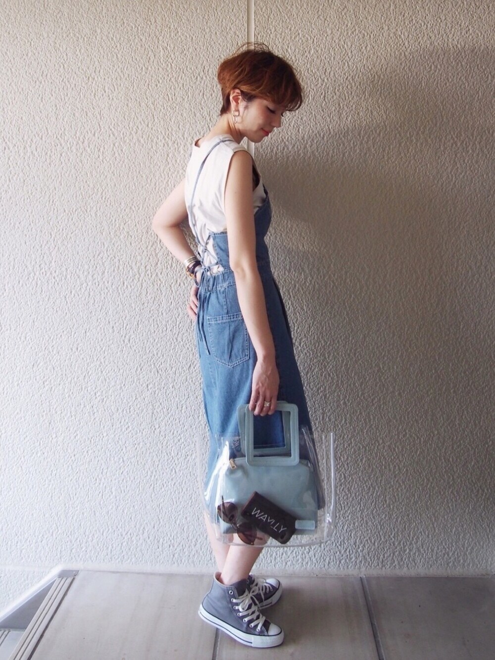 MISATO のトートバッグ「【2点セット】ポーチ付き角ベルトクリアバッグ(PVC)」を使ったコーディネート