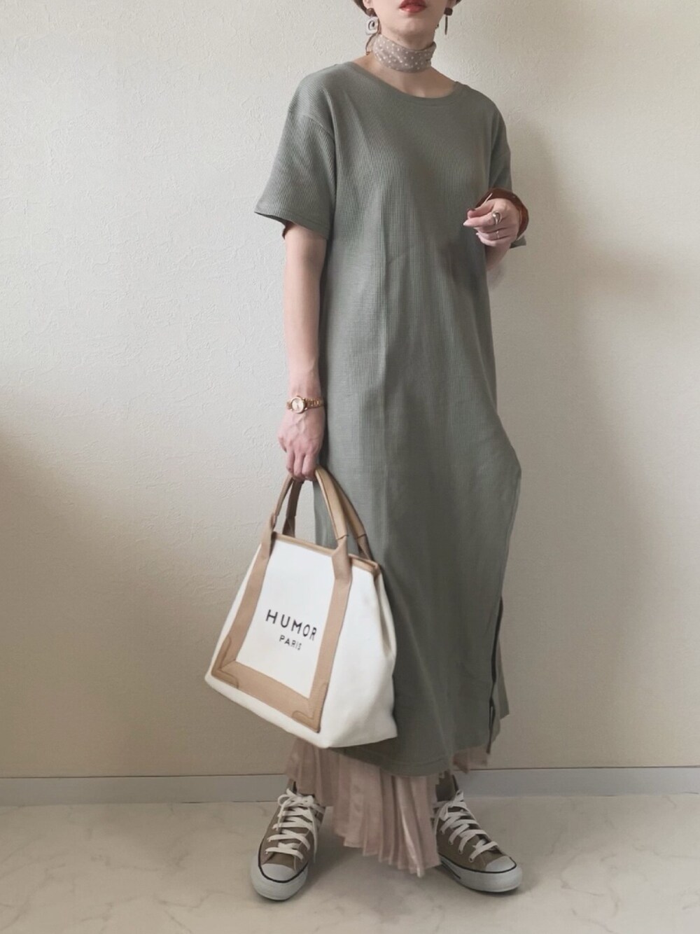 LIPSTARさんのワッフルワンピ、半袖バージョン♪ スリットワンピとプリーツスカートの相性抜群🙆♀️