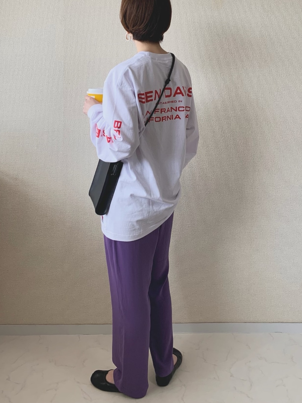 楽ちんスタイル♪ バックと袖のブランドロゴがかわいいBEN DAVISさんのロンT❤︎ 春はどこかに明るい色を入れたくなります💜