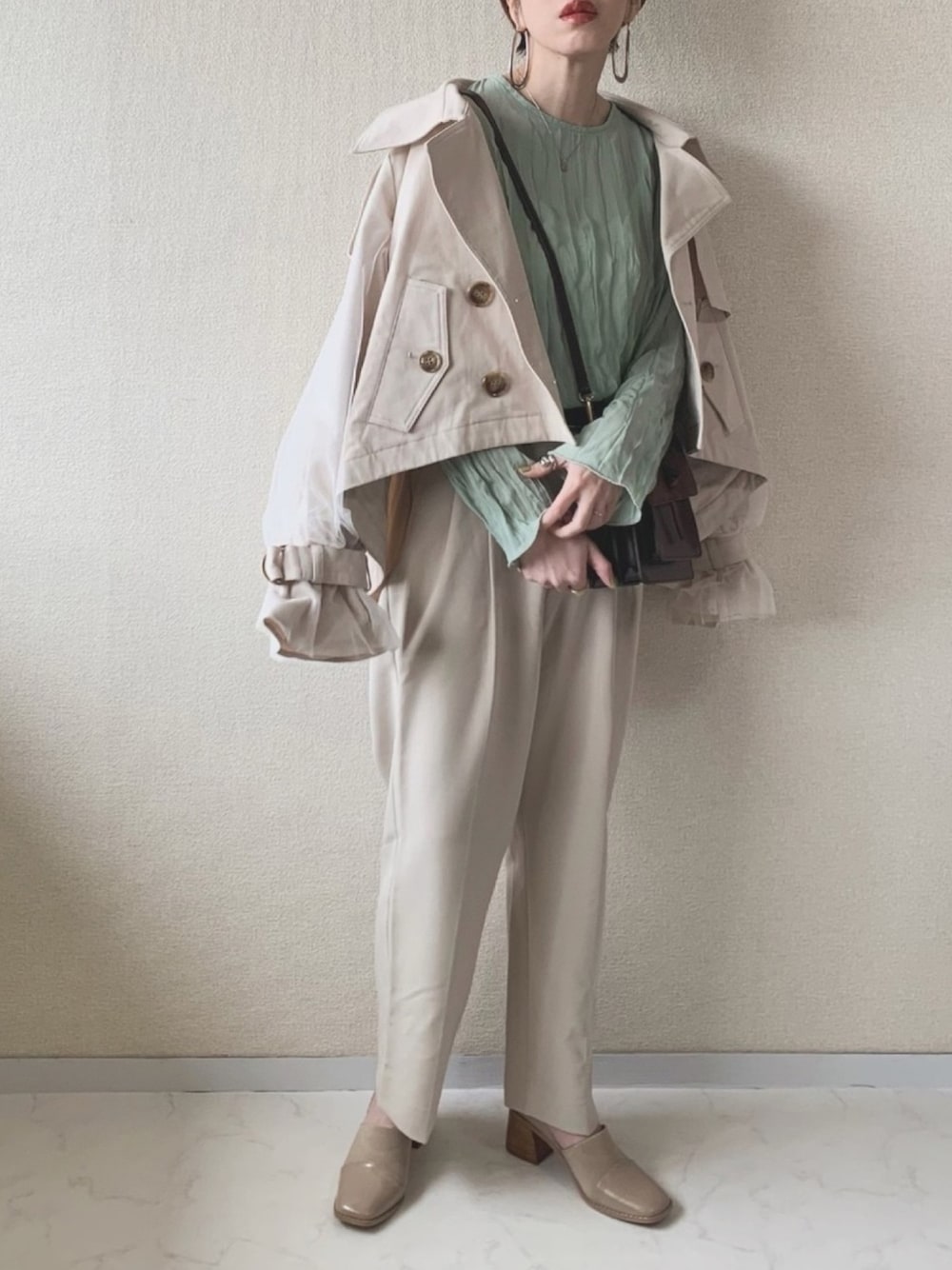 アウターとパンツの色を合わせて セットアップ風にしました! 春っぽくアントマリーズさんの ミントグリーンのトップスをポイントに🌿 本日クーポン出てます🥳🧡