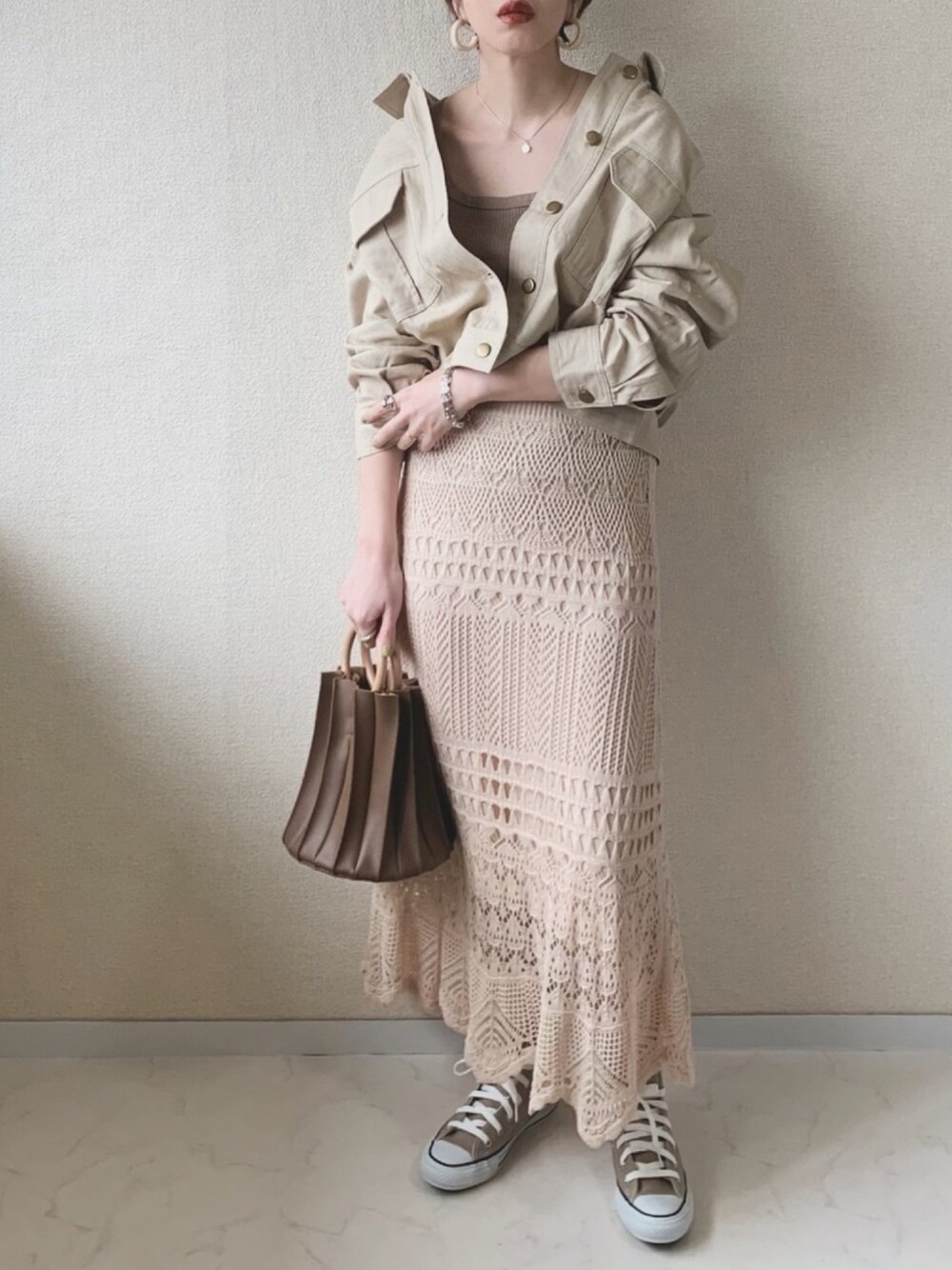 プチプラなベージュアイテムで ワントーンコーデ🐫 ショート丈のブルゾンはハイウエストの ボトムスと相性◎ アプレジュールミニョンさんのジャケットは ドロップショルダーの形がかわいいです❤️ 抜き襟して着る大人カジュアルコーデが オススメ👌🏽✨