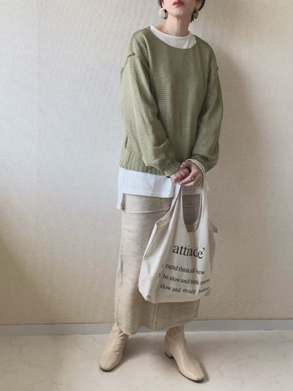 コラボのシアーニット🌿 カーキのお色は合わせやすくて◎ 本日クーポン出てます!