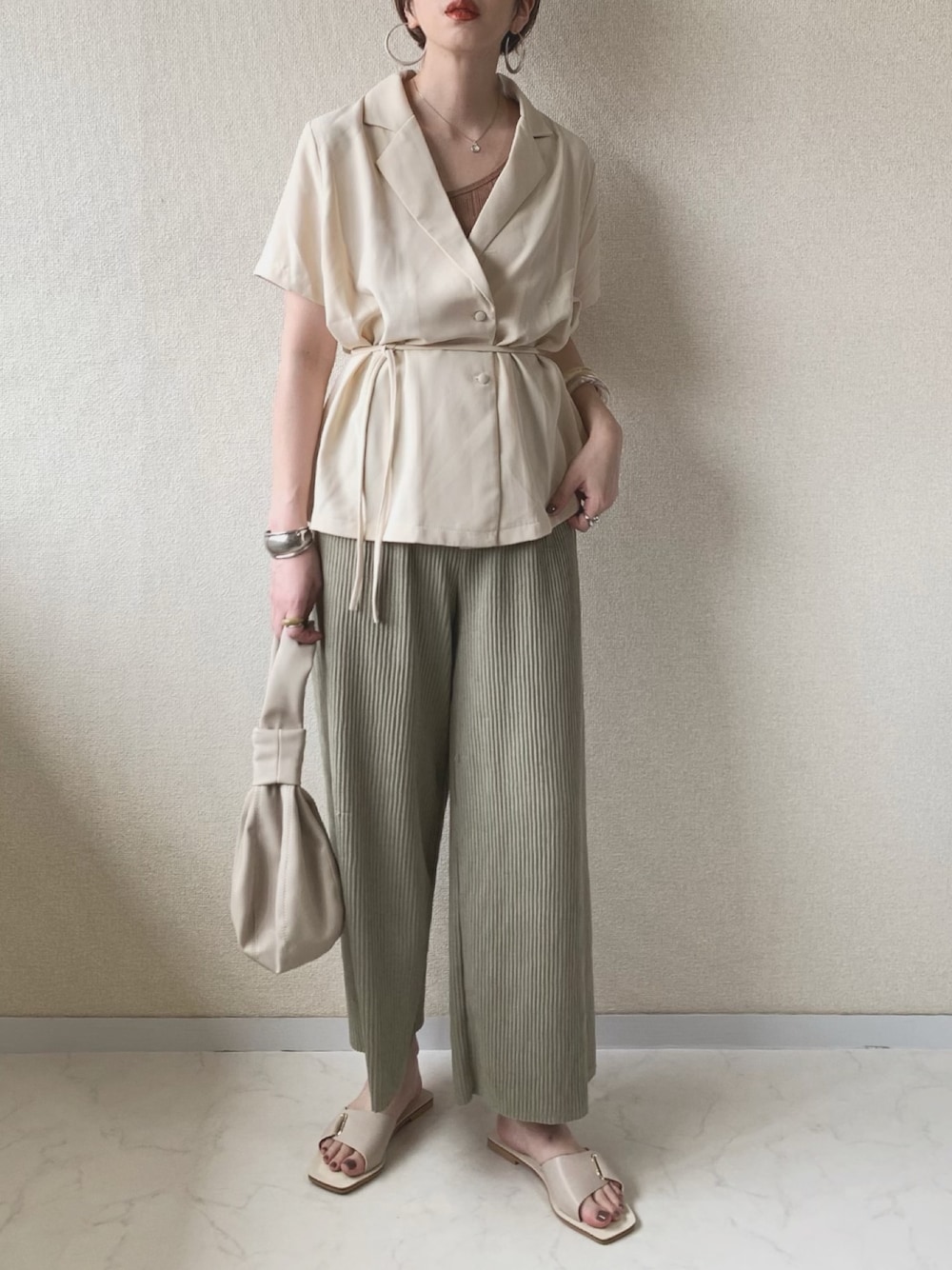 MISATO のシャツ/ブラウス「カシュクールジャケットシャツ/ルーズシルエットフロントボタンウエスト紐付き半袖ブラウス」を使ったコーディネート
