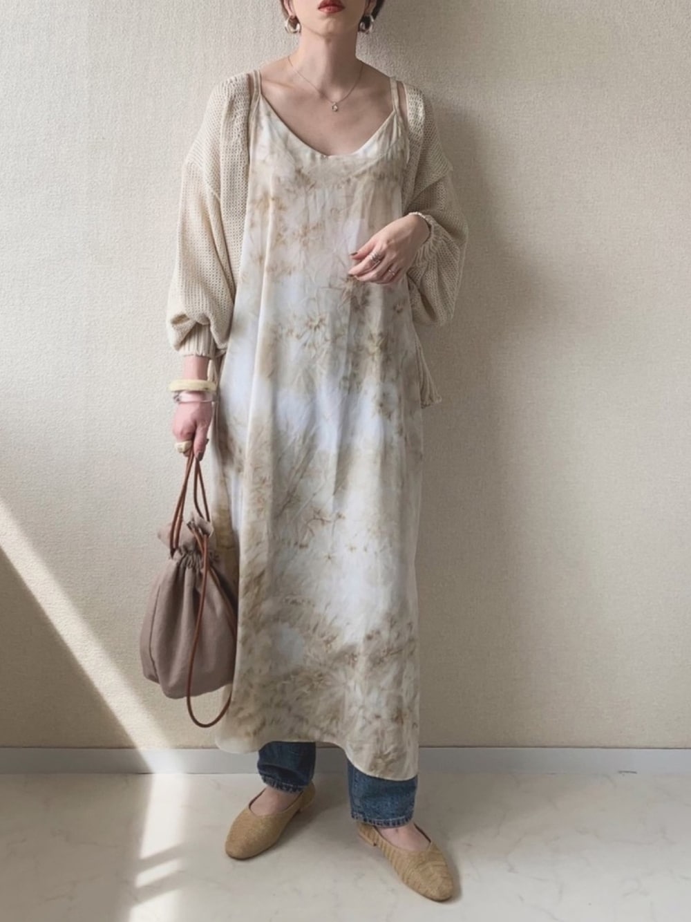 ニュアンスカラーのキャミワンピは ざっくりニットカーディガンを合わせてもかわいいですよ♡ デニム合わせでカジュアルにしました👖