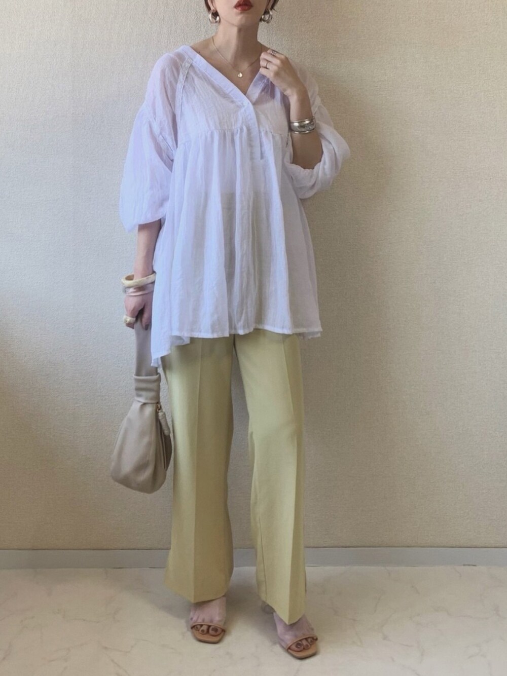 ふんわりブラウスにイエローのスリットパンツ💛 スリット入りのパンツは シルエットも綺麗で脚も綺麗に見えますよ♡