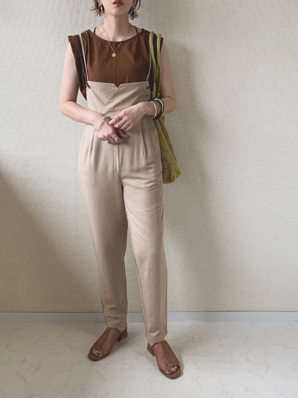 大好きなブラウンとベージュ🤎 プチプラでかわいいdholicさんの ノースリーブがかなり優秀👏 前後アンバランスな丈感で アウトスタイルも◎ サロペットはwillfullyさんです♡
