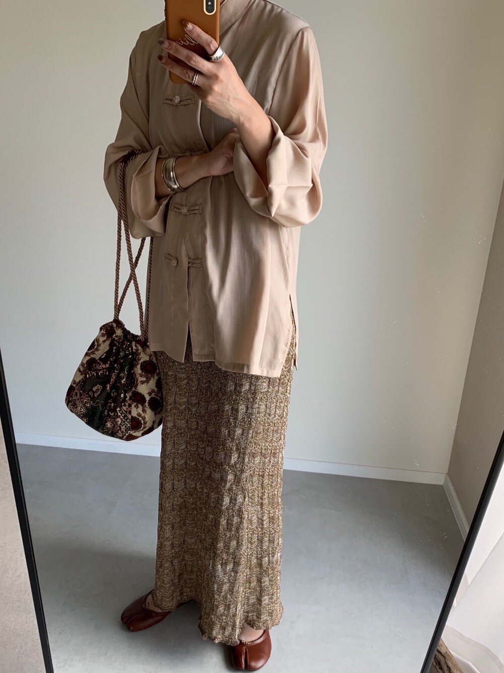 本日発売のopenCLOSE misato select♡ とろみのある生地感のチャイナブラウス🐼🇨🇳 タイトスカートと合わせて大人っぽく♡♡ アクセントにもなるパッチワークの巾着バッグも 発売になってます!