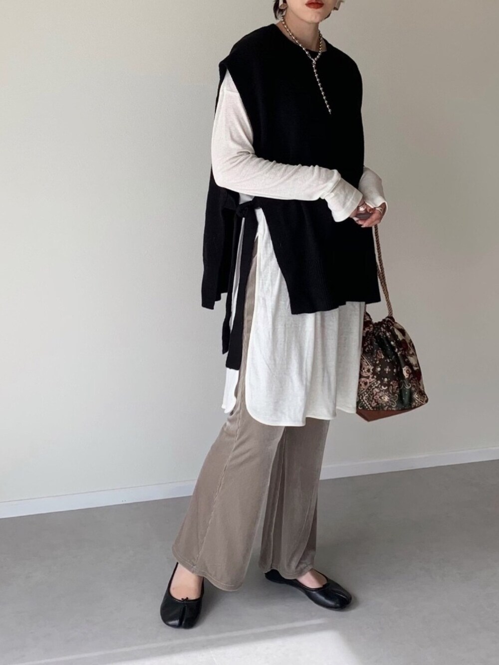 モノトーン🖤 秋冬にピッタリなベロアタッチのパンツ✨ ウエストもゴムで楽ちん♪ 光沢感あるから大人っぽく着こなせますよ◎ LB/Sでクーポン出ているので是非チェックしてみて下さい♡