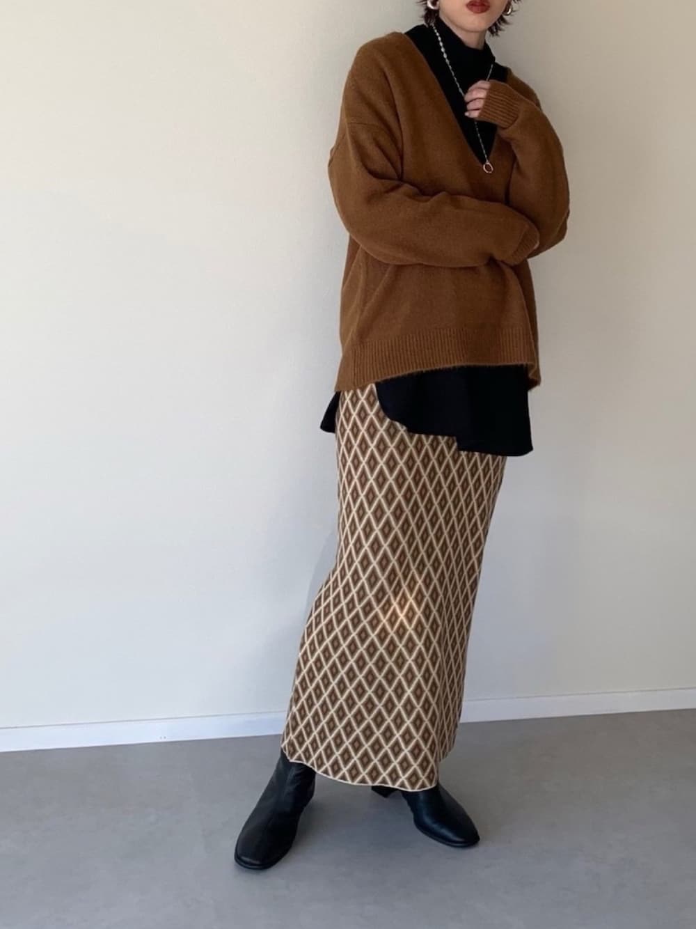 着まわし力抜群のy/mのVネックニット🧶 シンプルで飽きの来ないデザインで 合わせるインナーで雰囲気が変えられるので 一枚持っていると重宝します♡ ジオメトリックのスカートは めちゃくちゃシルエット綺麗で楽ちんなので おすすめです🙆♀️