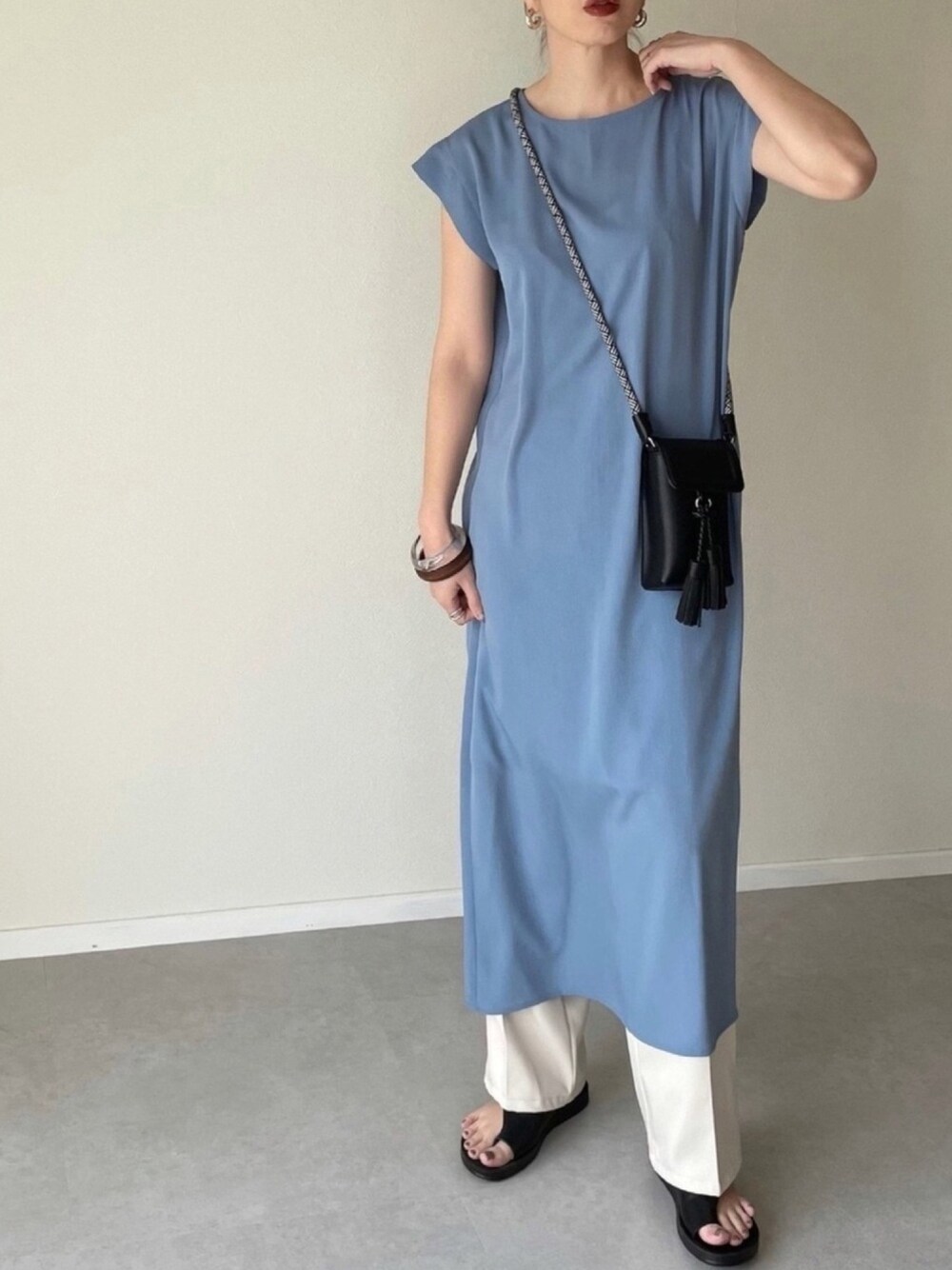 ダースティブルーが爽やかで大人っぽい印象の 楊柳ワンピース🫐 同色のキャミワンピース付きなので 透ける心配もなく着られますよ! 同素材のパンツとセットアップも可能です◎