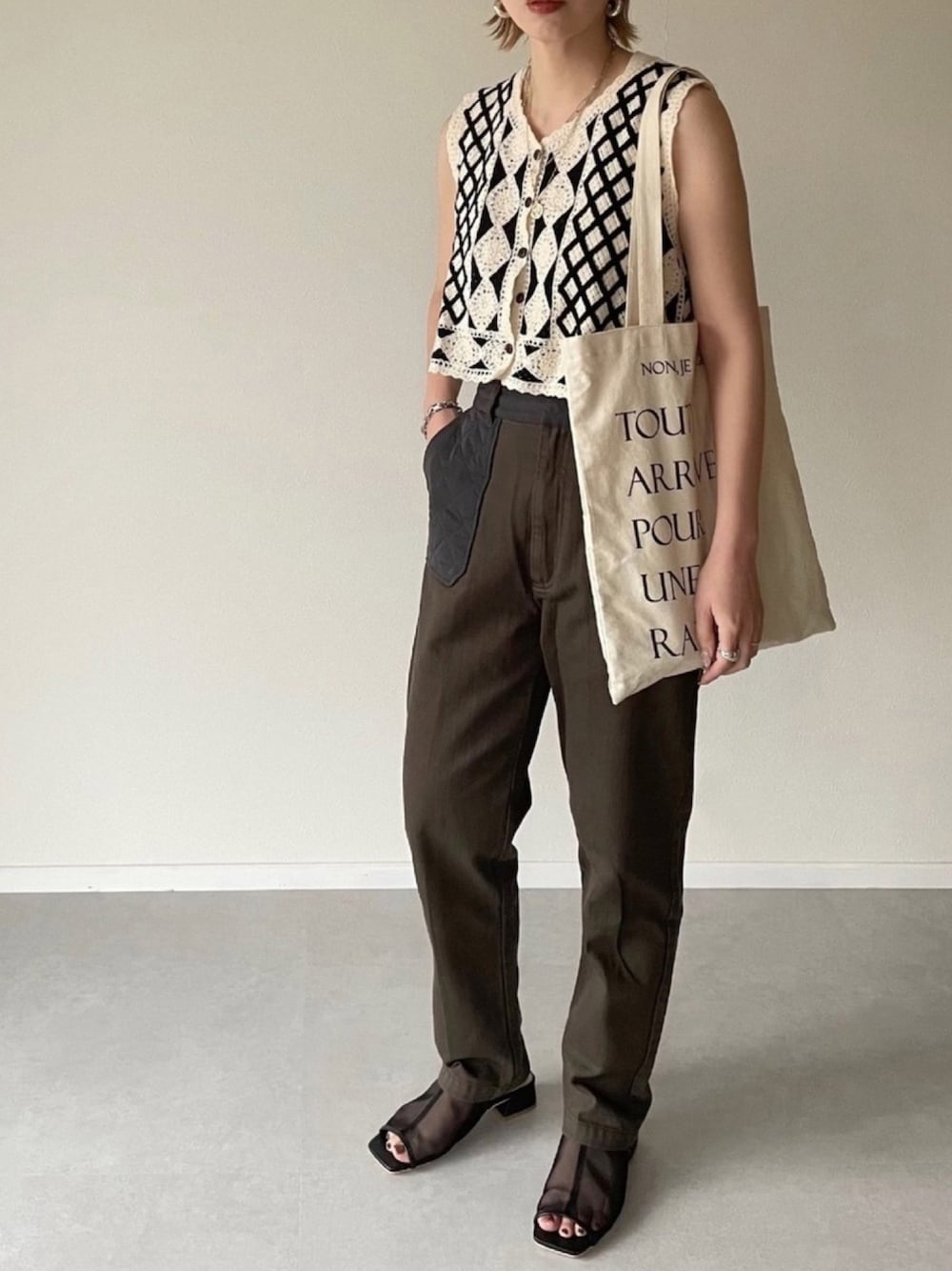 MISATO のベスト「かぎ針編みニットベスト」を使ったコーディネート