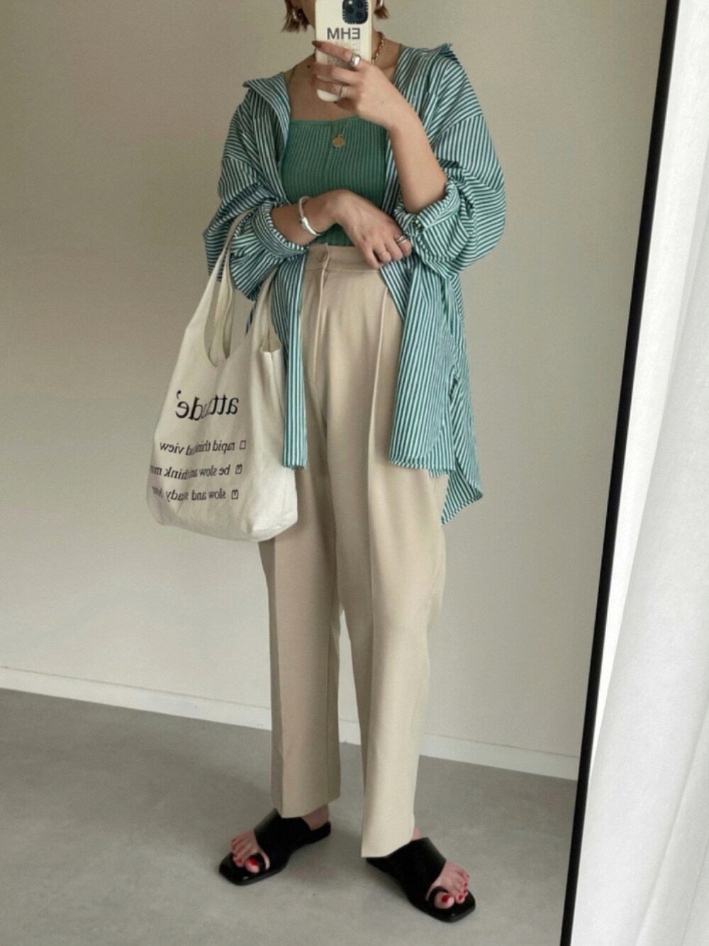 green×whiteの爽やかコーデ🌿 鮮やかなグリーンの色合いに一目惚れしたシャツ! ビッグシルエットで楽ちんな着心地♪ お尻まで隠れる丈感なので 体型カバーにもなる嬉しいアイテム♡ 少し腕まくりをする抜け感が出て かわいいですよね☺️✨ 足元はSENSE OF PLACE のサンダル👡 オシャレなトングデザインがかわいい♡ しっかりホールド感があるので 安定していて歩きやすいですよ◎ 本日ZOZOTOWNでお得なクーポン出てます👉🏽