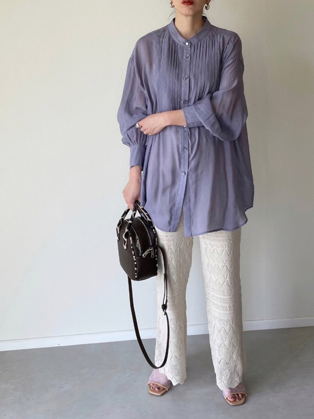 トレンドのシアーシャツに透かし編みパンツを合わせた夏コーデ♡ 透かし編みパンツは涼しい素材感がポイント♡ リネンライクで夏にぴったりです♪ TIME SALE & ¥1,000 coupon開催中です✨✨