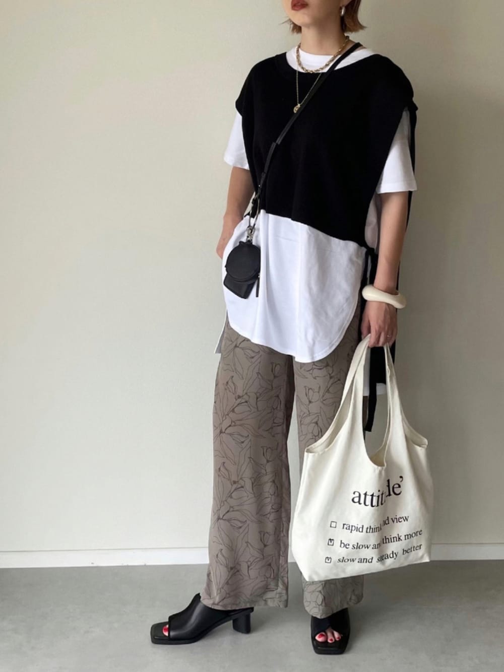 夏のレイヤードコーデ🖤 ずっと愛用しているお気に入りのベストに 繊細なフラワープリントがポイントの y/mのパンツを合わせました🌼 パンツは落ち感のある生地ですっきり 大人っぽく履けるのが特徴。 落ち着いたデザインなので 柄物が苦手な人にも挑戦しやすいデザインになってます◎