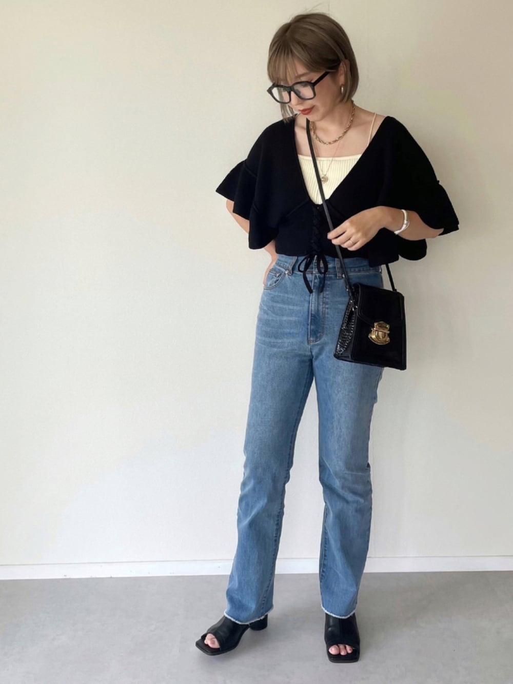 ビスチェにデニムを合わせた 大人カジュアルコーデ♡ まだまだ暑いですが y/mのAWの新作も取り入れて 少し秋意識🍂 スクエアの形がかわいいバッグは CONTROL FREAKのもの。 クロコの型押しでコーデのアクセントにも◎