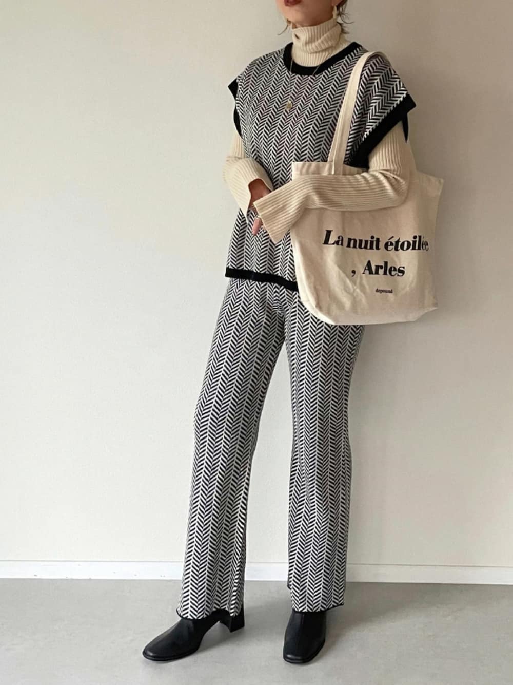y/mの新作の幾何学柄ジャガードベストとパンツです♪ 存在感ある幾何学柄がポイントです♡ ベストはシンプルなトップスやワンピースに合わせるとかわいいですよ◎ ニットパンツもストレスフリーな履き心地で 程よくフレアになっているので 美脚見えするおすすめパンツです♪ 本日より発売STARTしました🌟
