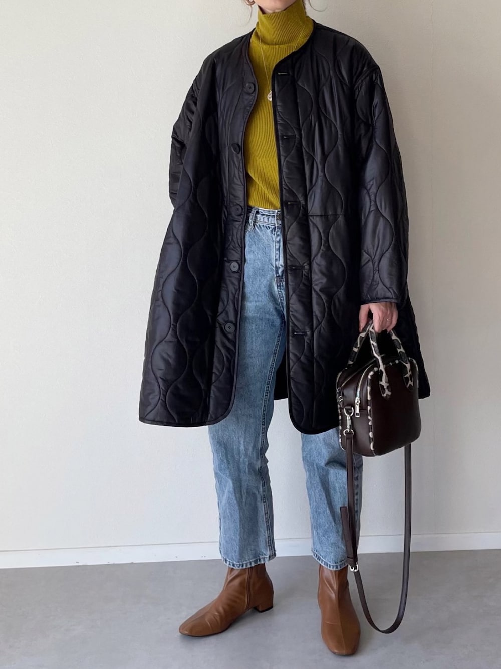 MISATO のノーカラーコート「中綿入りノーカラーキルティングコート」を使ったコーディネート