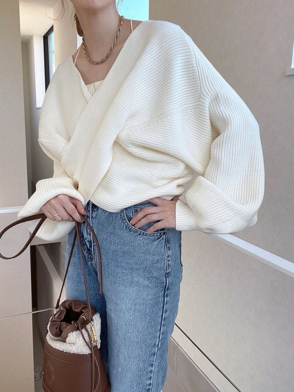 OLUPICのクロスデザインニット♡ 綺麗にデコルテが見えるデザインなので キャミと合わせてみました💫 これからの時期は中にタートルを合わせても 良さそう☺️ 袖にもたっぷりのボリュームがあって 一枚で存在感あるデザインがお気に入り! SHOPLIST店で¥3,000 OFFのタイムセール 開催中です💫