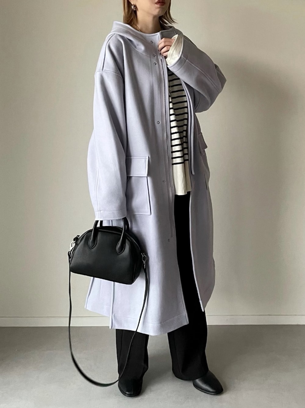 綺麗なラベンダーカラーのKBFのコート💜 サイドタックのデザインで ゆったりしているけど シルエットがとってもきれいです◎ フード付きなのでカジュアル合わせが しっくりきました☺️✌️ 今ならTIME SALE でお得になってます♡