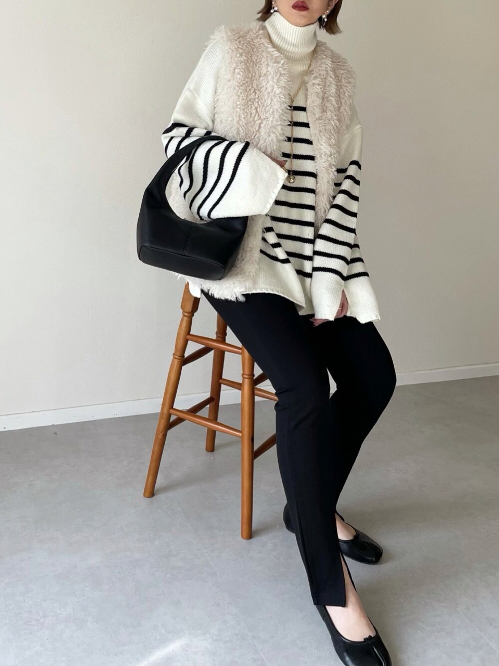 モノトーンコーデにもこもこファーベスト🐻💭 パンツはDONOBANのスリットパギンス♡ ストレッチが効いているので レギンス感覚で履ける楽ちんパンツ☺️ スリットが抜け感あってめちゃくちゃおしゃれです◎