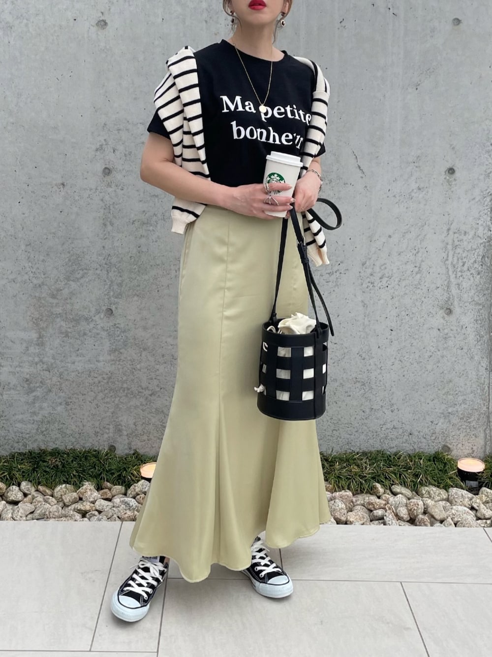 カジュアルなロゴTを マーメイドで女性らしく♡♡ Tシャツは5/16(mon)発売のy/m by misato コンパクトなサイズ感で 一枚着でもインナー使いにも 着まわしやすいアイテムです✌🏼