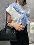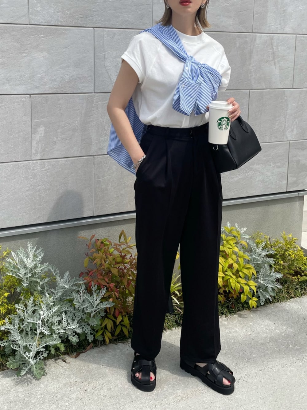 モノトーンコーデのポイントに ストライプシャツをたすき掛け👔 着まわしやすいシンプルカットソーは 本日発売のコットンモックネックTシャツ♡ 一枚着でもレイヤードにもおすすめです🪄
