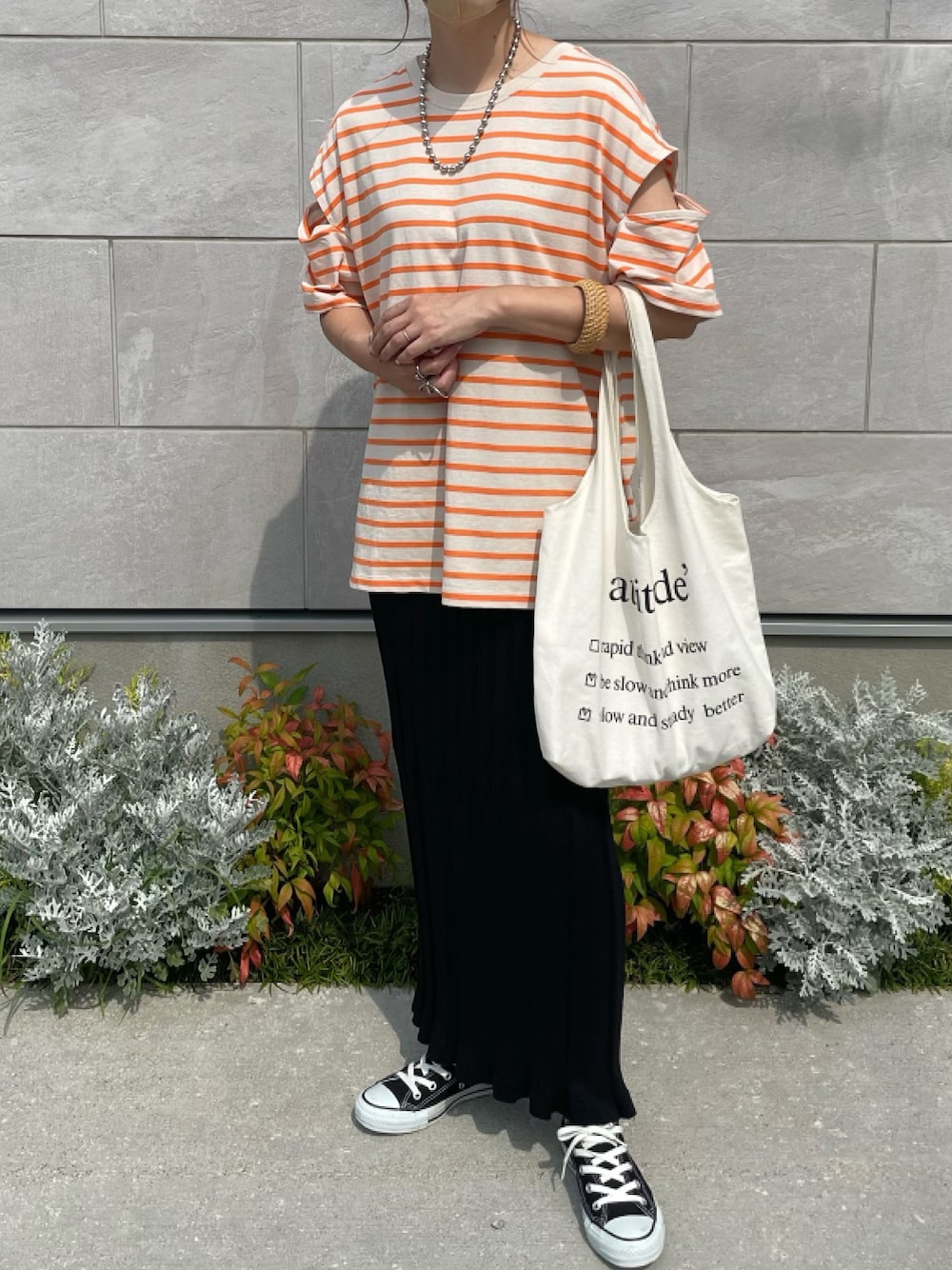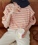 袖スリットがかわいいオレンジボーダー🍊 シルエットもゆったりで楽ちんな着心地♡ スカートはSELECT MOCA by misatoの リブスカート🖤 サマーニット素材なので 夏でも涼しく着られます◎ TIME SALE 中なのでぜひチェックしてみて下さい♡