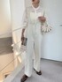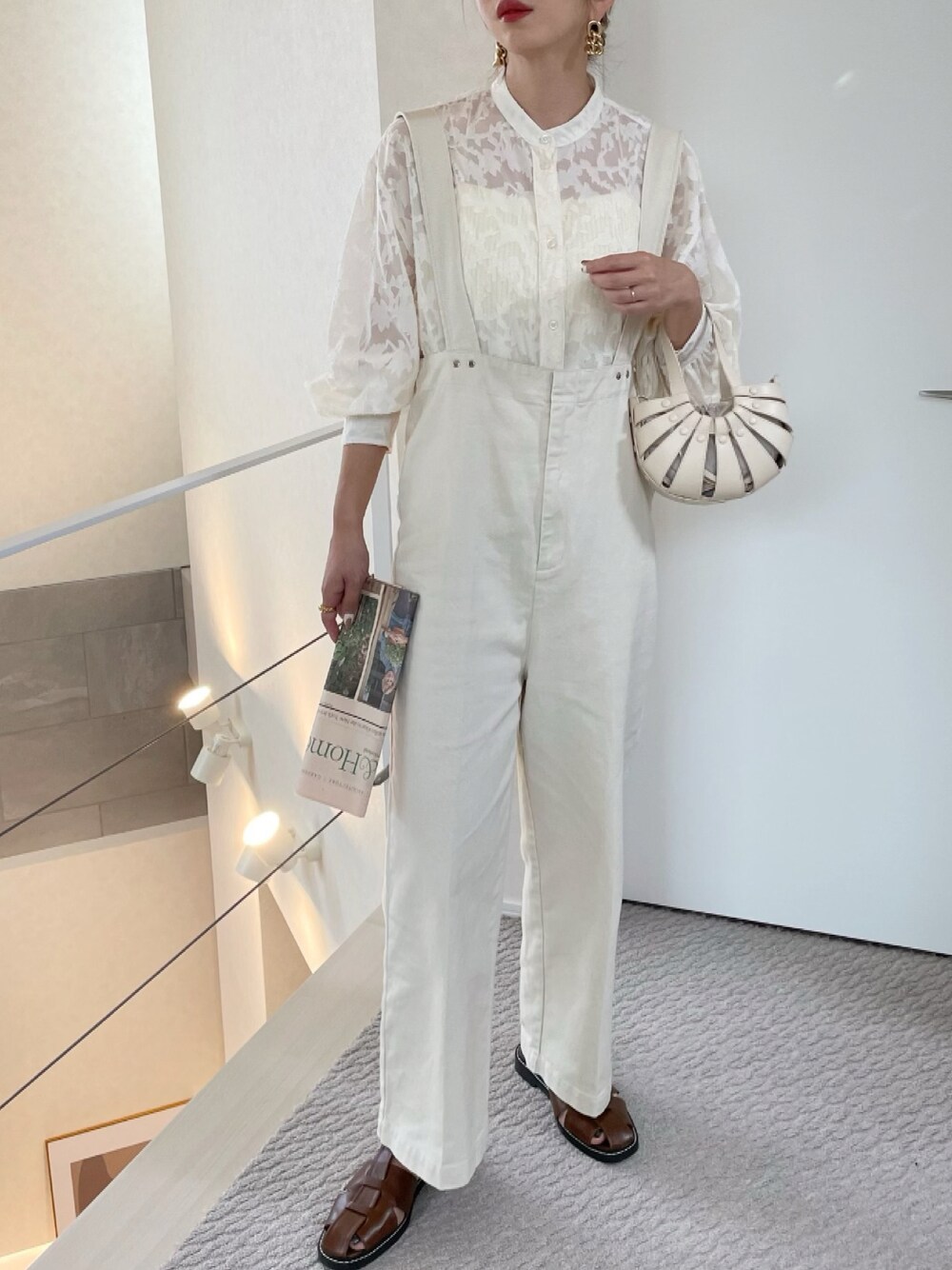レースブラウスとサロペットの ワントーンコーデ🤍 レースシャツはTIME SALE中で 10% OFFに🤍 今日なら¥1,000クーポン出てるので 更にお買い得にGETできちゃいます🤭💕