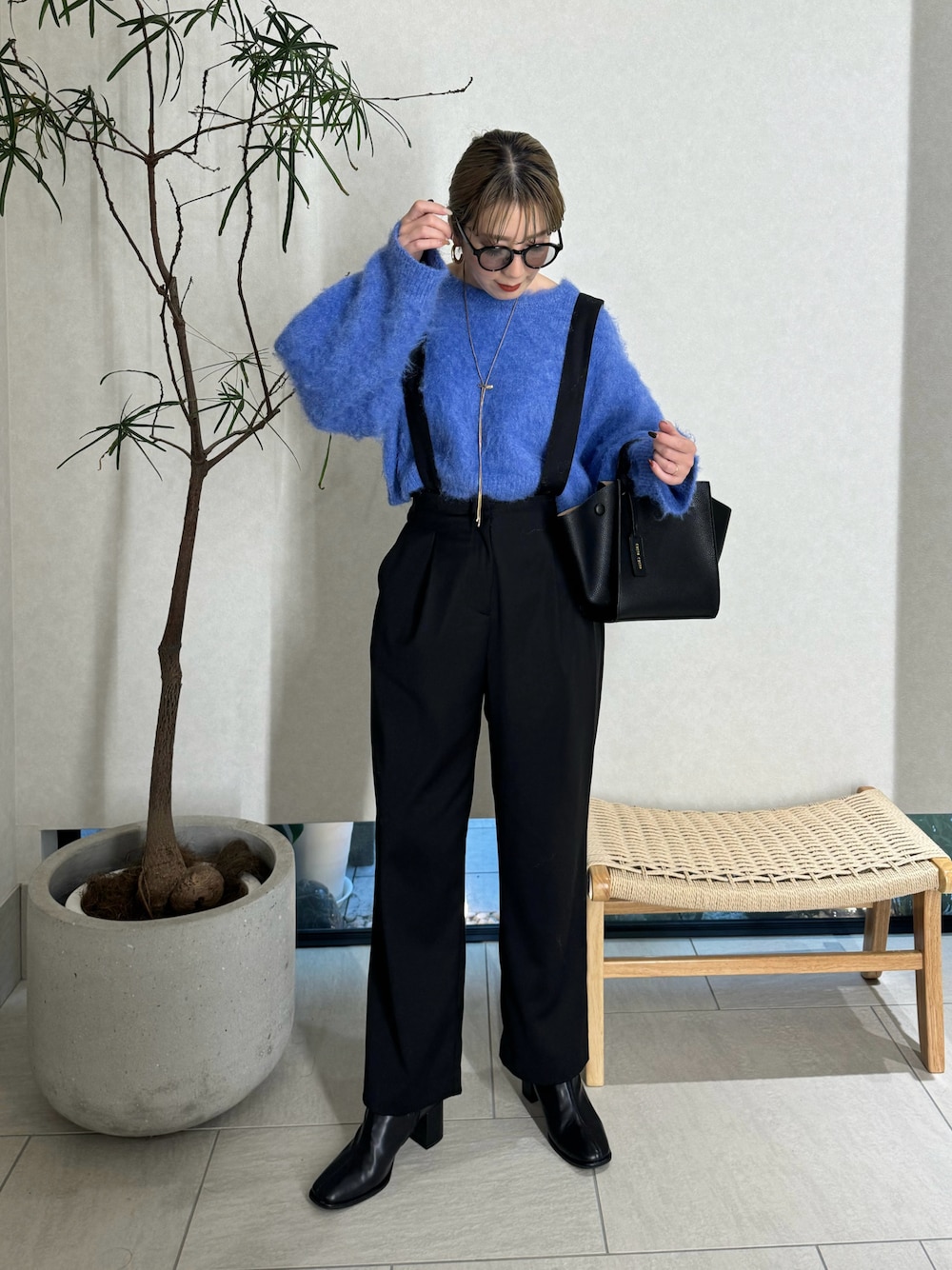 カラーニットコーデ💙 Marientのサスペンダーパンツは 取り外しも出来る2way!! 滑らかタッチでシルエットも綺麗🙌🏻 大人コーデにぴったり◎