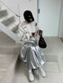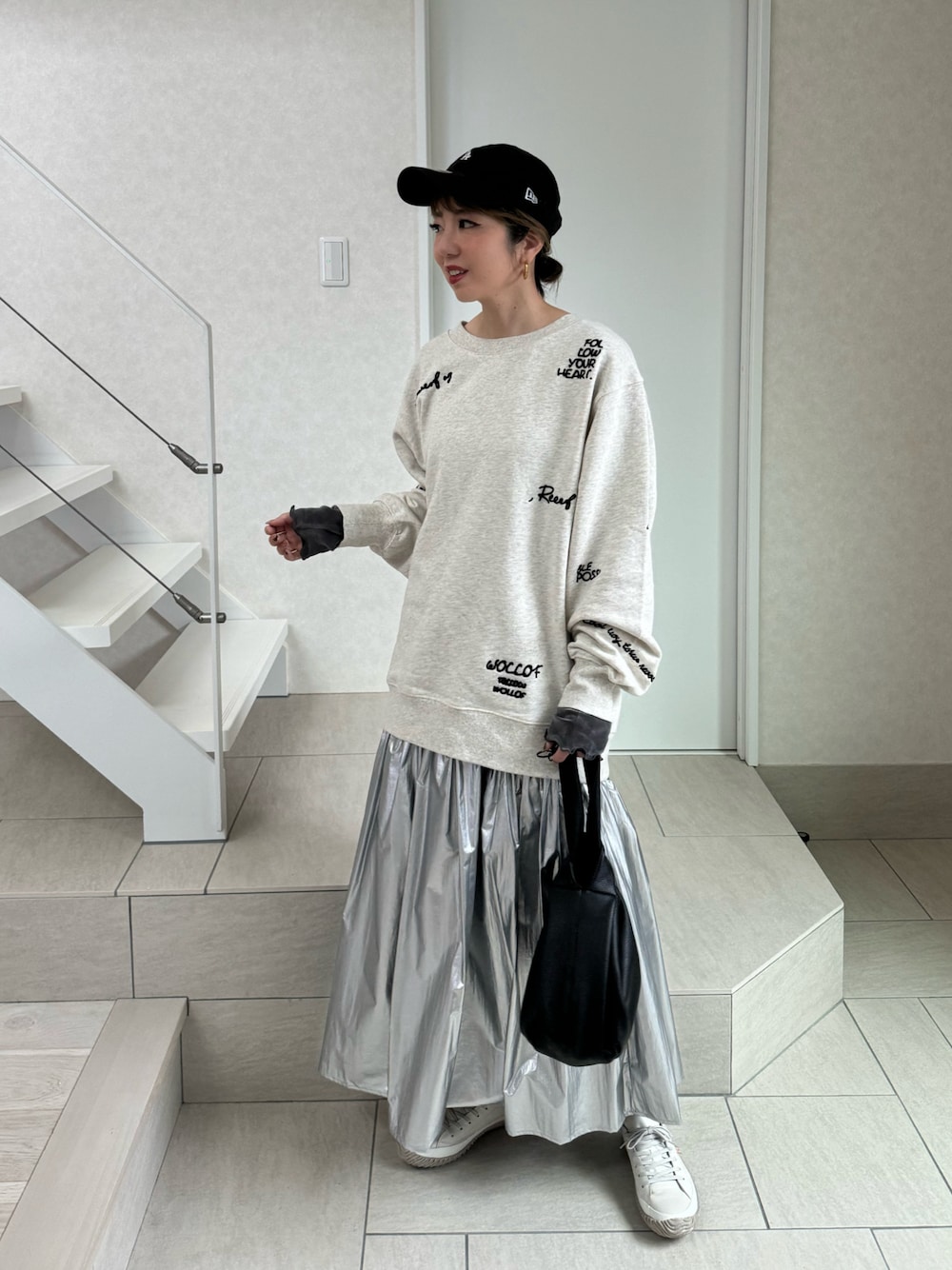 トレンドのメタリックスカートに ランダムロゴがかわいいスウェット🩶 定番のシルバーは何にでも合わせやすい♡ ワントーンでもメタリックが アクセントになってかわいい✌🏻 足元はスニーカーでカジュアルに👟