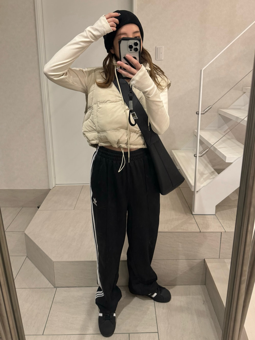 カジュアルなストリートコーデ✨ ショート丈のダウンベストとアディダスのトラックパンツで、動きやすさとトレンド感を両立! アクセサリーやバッグをミニマルにまとめて、 全体的にバランスのとれた雰囲気に! 寒い日のお出かけにぴったりのスタイル⛄️🖤