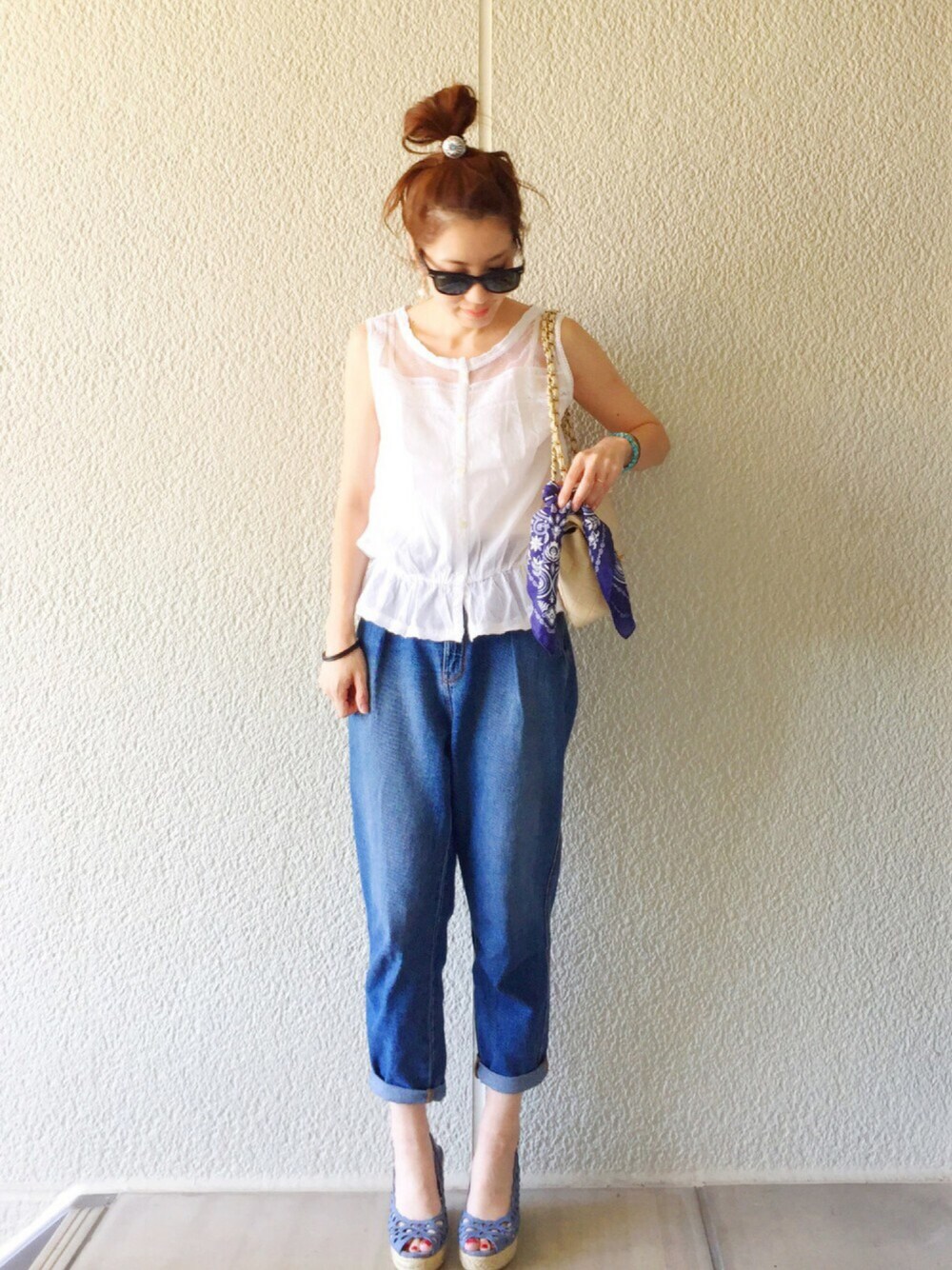 今日は小物ブルーで! 3色揃った! なんやろ、この達成感(笑)。 自己満足🎵 そして、この3(信号)コーデ、、、 全部マムジーンズを使いました。 変なこだわり。(笑)
