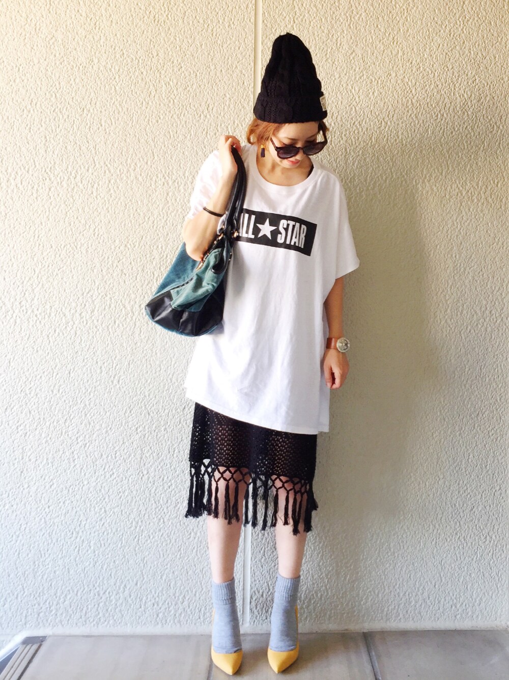 オールスターのチュニックT、これホワイトのフリンジショートパンツと合わせてあって、可愛い~~と思って買ったやつ。 あ、でもホワイトのショーパンもってないや、、、 普通のデニムのショーパンと合わせてみたら、子供っぽくなった😭 黒のスキニーパンツ、無難に可愛い感じ👍✨ デニム、間違いない感じ👍✨ このシルエット生かすには一枚で着るのが可愛い~~🤔✨ でも、足出すの嫌。 迷ったあげく、フリンジのニットワンピと合わせました😅 オールスター、なんか元気なイメージにしたくて靴は黄色入れました。 フォロアーのyuiちゃんも、同んなじTです😆🎵 @yuiuy5620