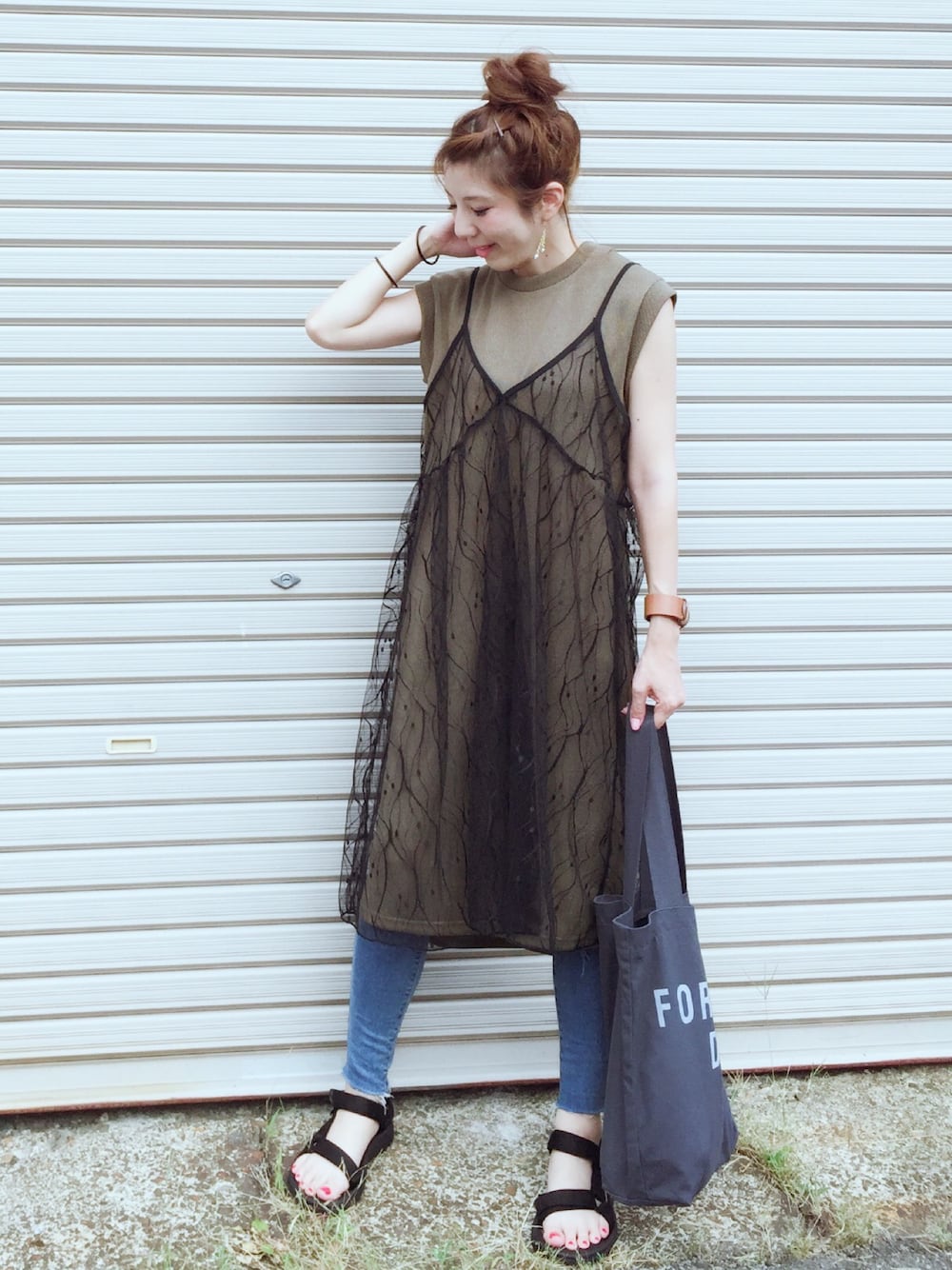 このレースワンピ、周りからも好評😎✨ 今日は中のワンピ、カーキで。