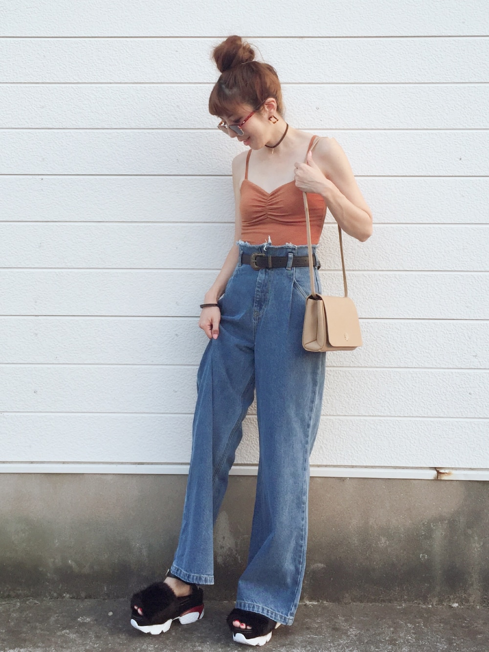 今日もビスチェスタイルです👻💫 リブビスチェは人気のテラコッタカラーにしました! テラコッタにはデニムを合わせたくなります。 今日はドラフトでよく履かせて頂いたデニムと合わせました👖✨ 今季狙っていたファーサンダル! このファーサンダル、ボリュームあって凄く可愛い♡ ソールがスニーカーなのでとっても歩きやすいです😎👍✨
