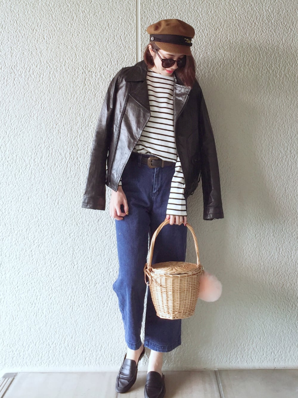 シンプルスタイルにライダースを合わせたコーデ♡ ライダース入れるとコーデが引き締まるような気がします♡ このライダースもお気に入りやけど、もう少し丈が短いのも欲しいのです。。。 moussyのキャスケット、ずっと前から欲しくて、ダメもとで再入荷のメールを設定しておいたら、、、、 来た来た💌✨ あー、ラッキー😍💕