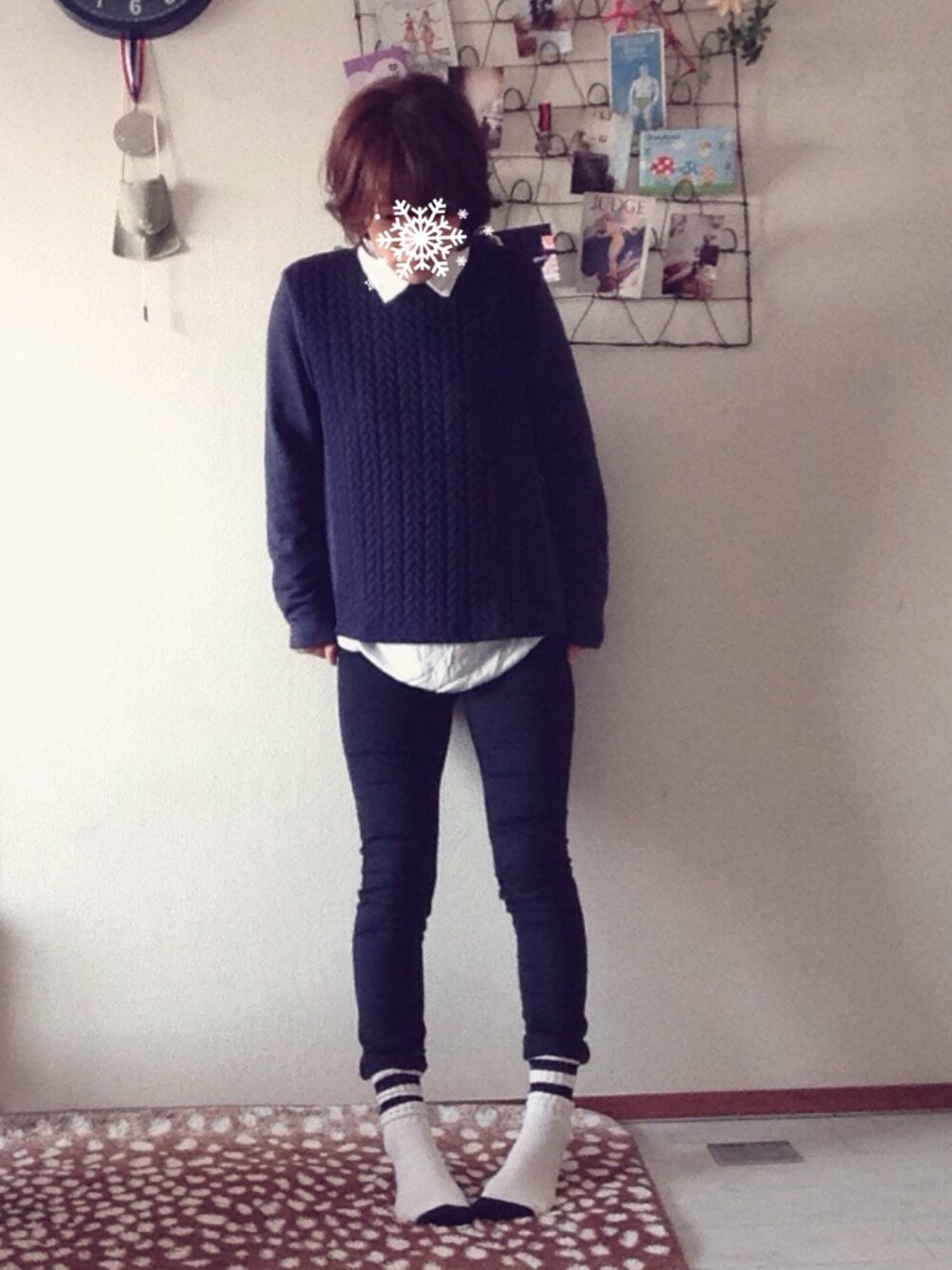 紺スウェット 2000円くらい ikka 風が冷たい。