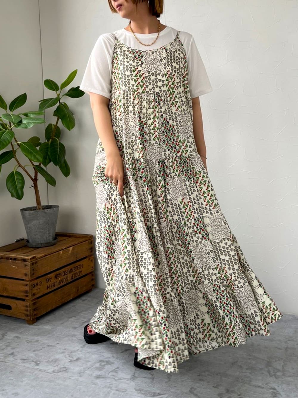 🟩Instagram/00miscere00 ☑️ アソート柄ティアードキャミワンピース WH×BR/WH×NV ONE SIZE model/152cm