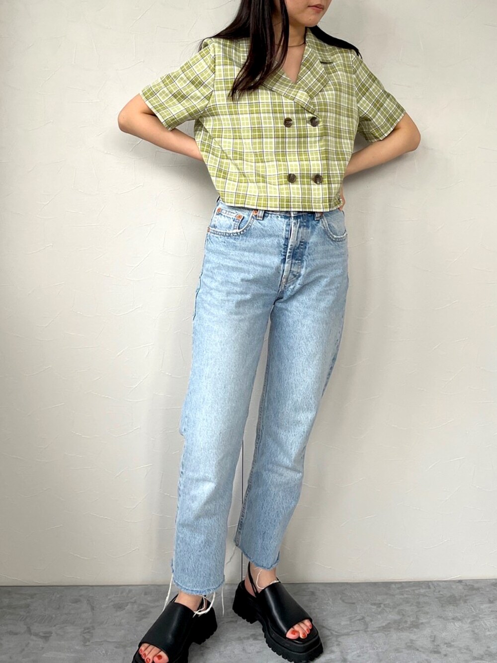 🟩Instagram/00miscere00 ☑️ チェック柄ショート開衿シャツ GR/OR/BK ONE SIZE model/160cm