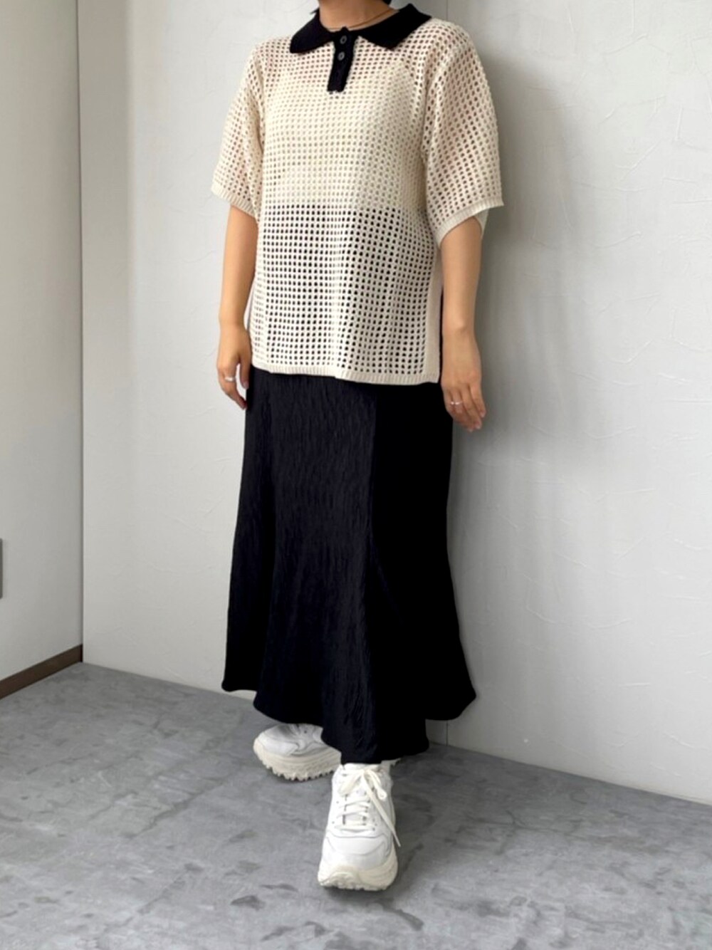 🟩Instagram/00miscere00 ☑️ バイカラーメッシュ編みポロ color:IV/BK size:FREE ☑️ プリーツ加工カット マーメイドSK color:BK/BR/BE/OR size:FREE model/152cm