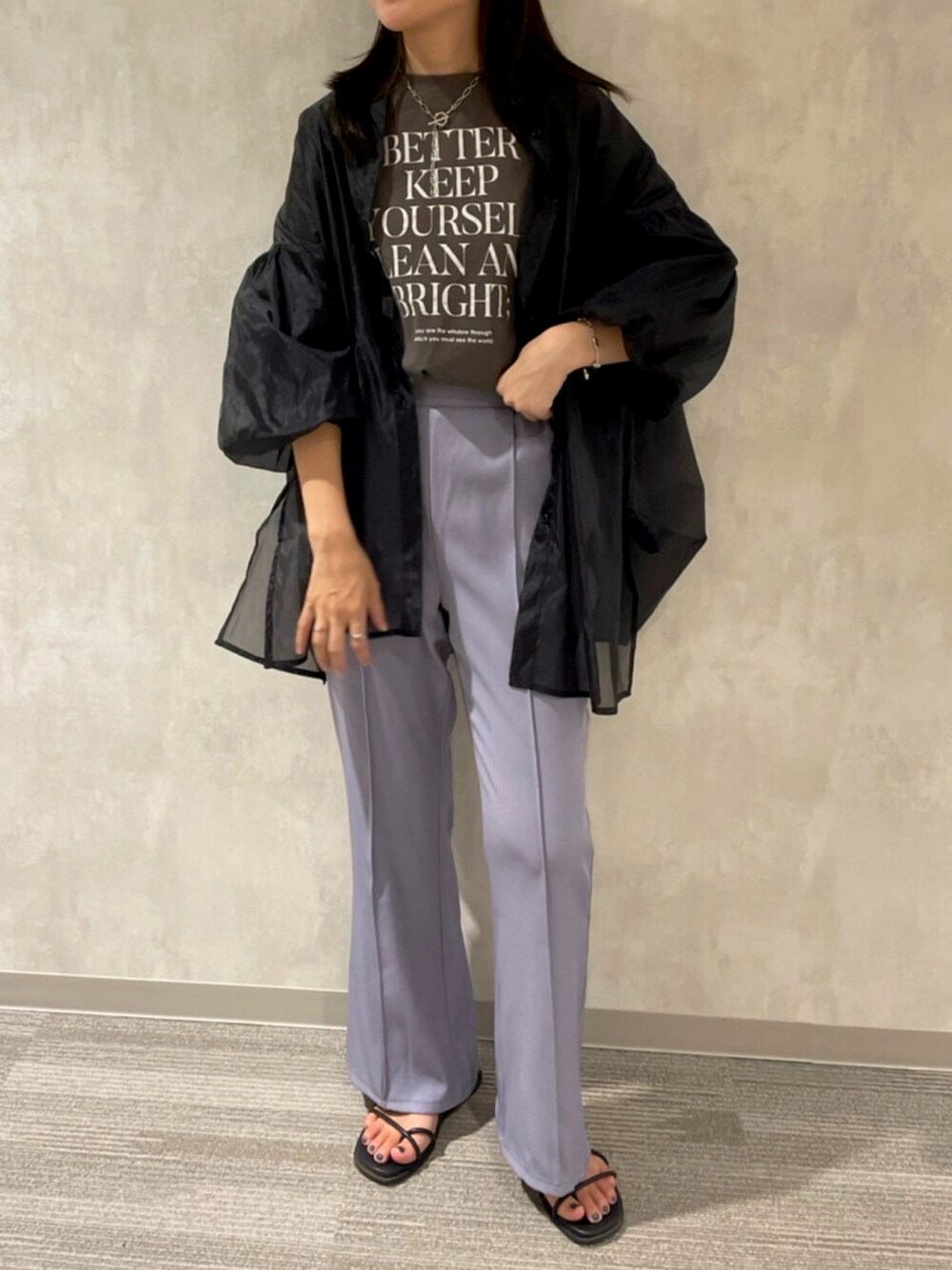 🟩Instagram:00miscere00 ♦︎ 英字ロゴプリントTee color:WH/PP/SBK size:FREE ♦︎ オーガンジーバッグギャザーブラウス color:BR/GR/BK size:FREE ♦︎ センターシームPT color:BE/LV/MGR/BK size:FREE model:160cm