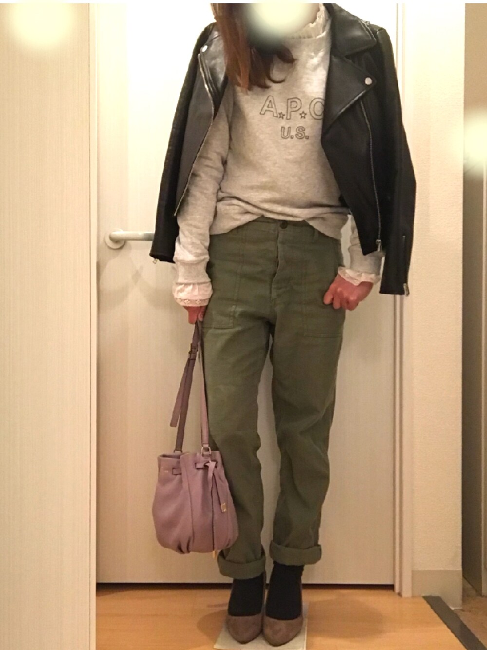 お気に入りのライダースコーデ ブラウスとパンプスとバッグで少し女性っぽさを出しました。このカーキのパンツが好きすぎて着回しています。 見ていただきありがとうございます。