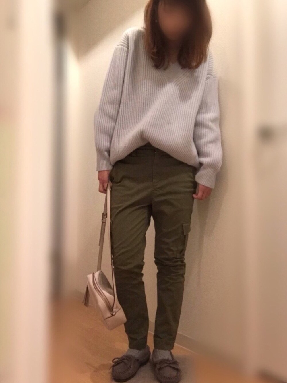 昨日の夜コーデ 寒すぎて春服が着れず😭色味だけでも春😅 ライトブルー×カーキ×ホワイト
