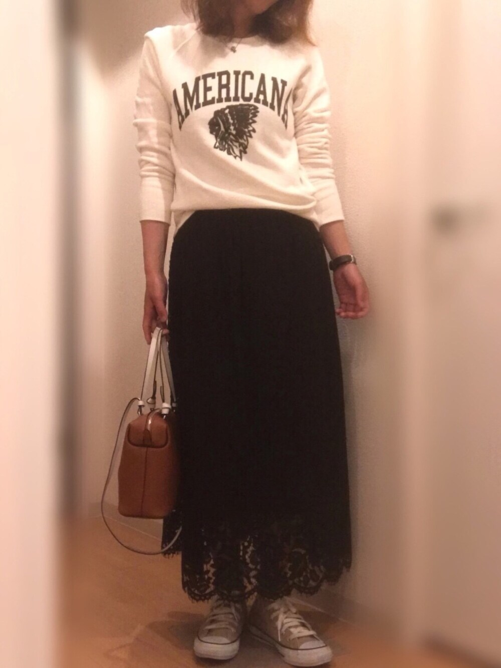 昨日の夜コーデ スウェット×レーススカート 夜は肌寒かったのでスウェットに。
