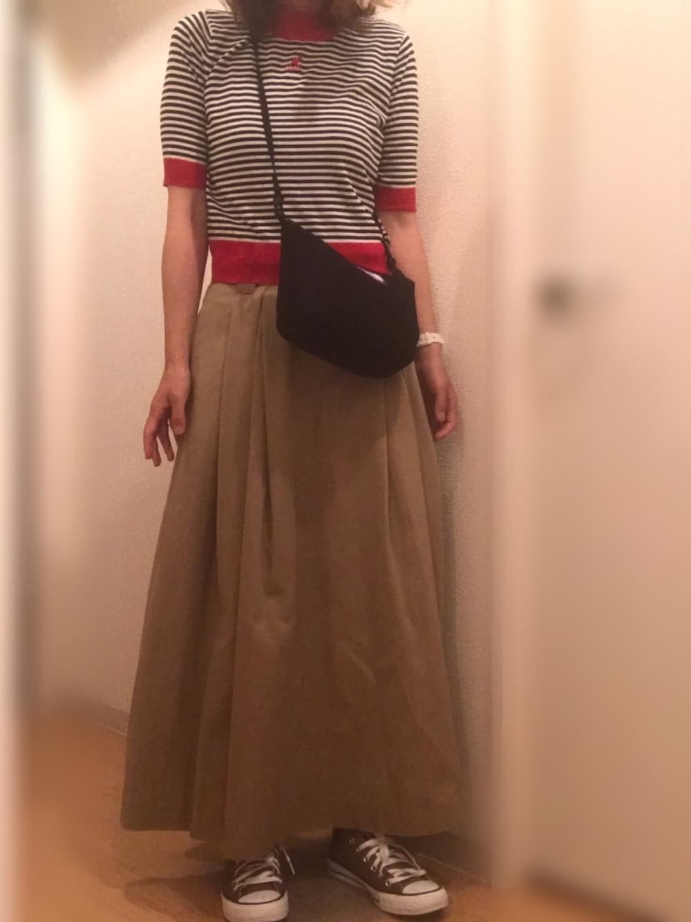昨日のコーデ レッド×ベージュ 着回し🙌 ショート丈のトップスとボリュームスカートの相性◎