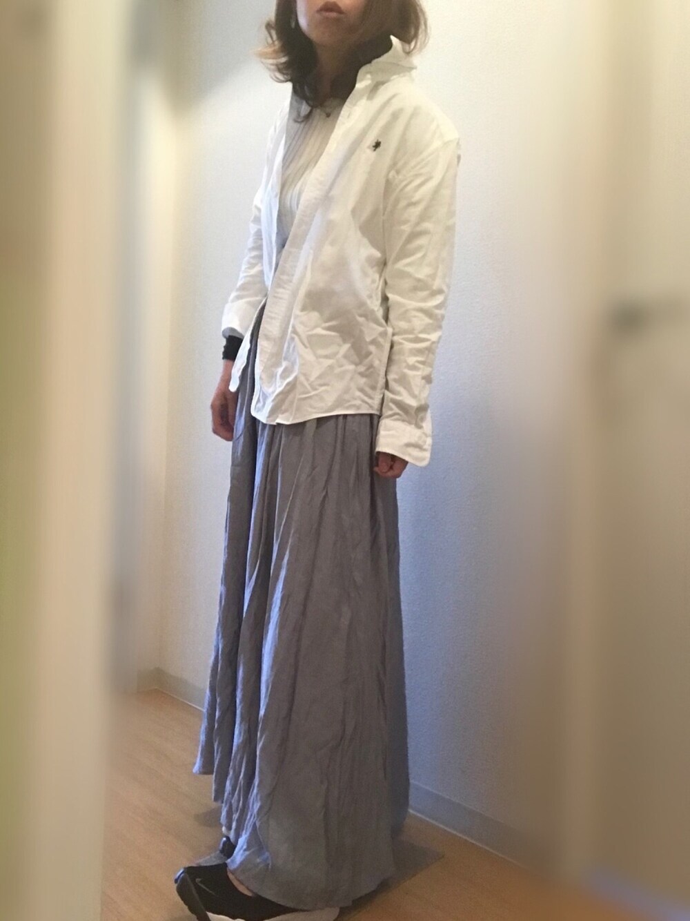 昨日のコーデ いい天気だったのでホワイト×ブルーにしました🍀 全部何年も着回している服😌