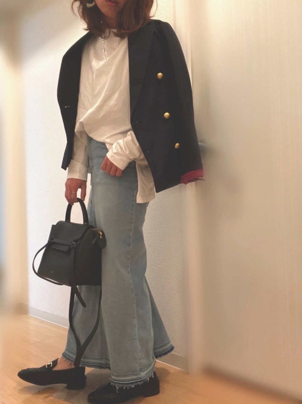やっとGW⭐︎長い休みで好きな服を着て気分転換🍀 デニムスカートは裾がフレアになっていて珍しいデザイン。かなりストレッチが効いていて履き心地💯 カットソーもゆるいのに形がきれいでお気に入り😌
