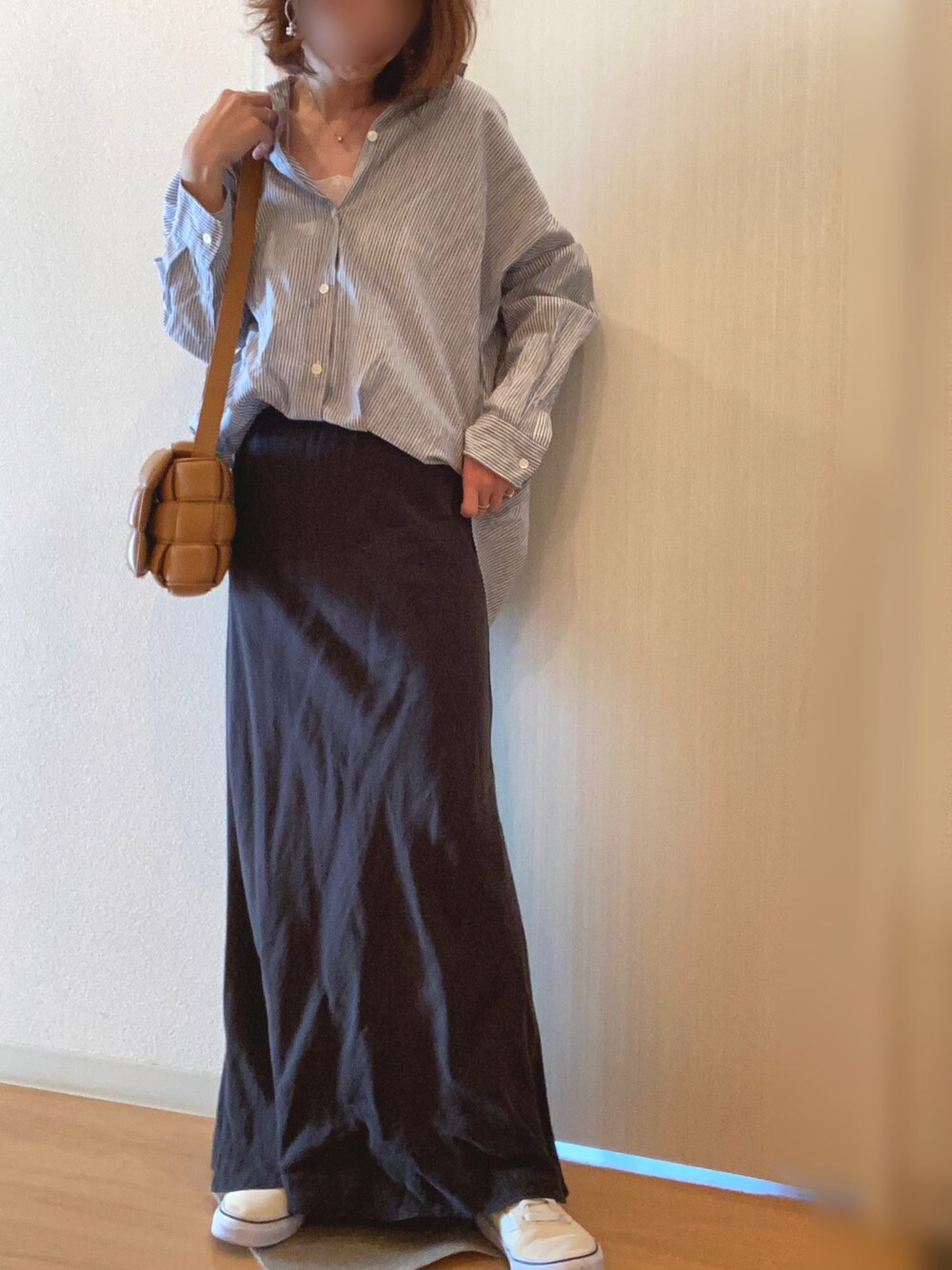 昨日のコーデ ゆるシャツと形のきれいなスカート😌