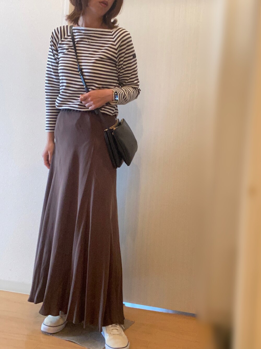 昨日のブラウンコーデ🤎 随分前に買っておいてタイミングが合わず着れていなかったnewの服。 ルミノアのカットソーは大好きなスクエアネック。ブラウンのボーダーが珍しく即決。 plageのスカートは安定の形のきれいさ。