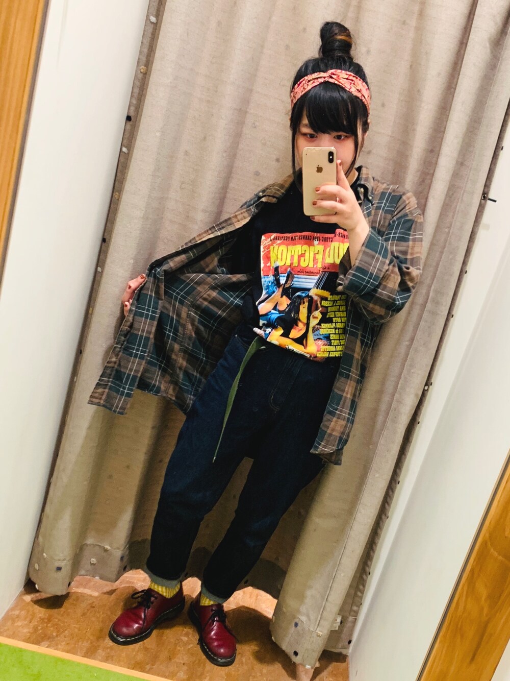 GUのテーバードアンクルパンツみたいなやつ昨日買いました! パルプフィクションのTシャツは古着屋さんで!かっこいいでしょ!